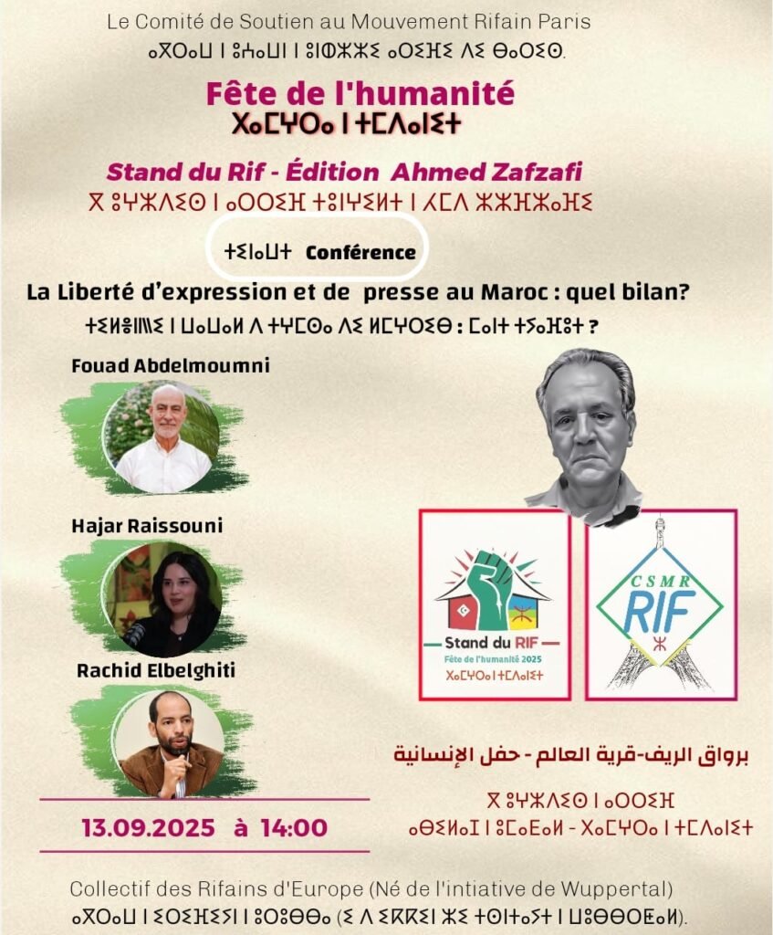 À l’occasion de la Fête de l’Humanité 2025, le Comité de Soutien au Mouvement Rifain – Paris (CSMR) et le Collectif des Rifains d’Europe vous donnent rendez-vous les 12 et 13 septembre 2025 au Village du Monde, pour une édition exceptionnelle du Stand du Rif – Édition Ahmed Zafzafi.
